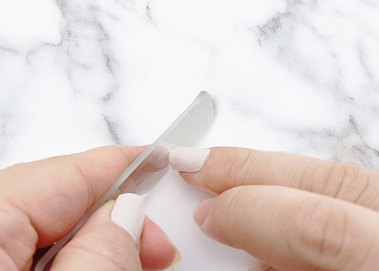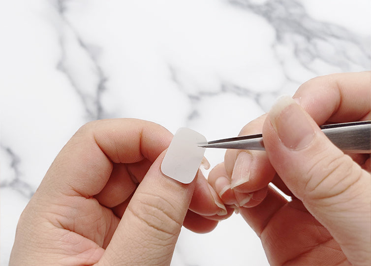 手は清潔な状態で、リムーバーやアルコールなどで爪とその周辺の水分・油分を除去してください。 事前にネイルケアとして甘爪処理をしておくと仕上がりがきれいに見えます。