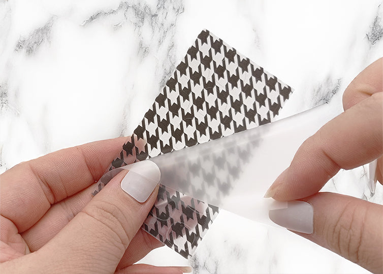 ステッカーは粘着と接しているPETフィルムと、トップコートを保護している保護フィルムがあります。保護フィルムの方を剥がして爪サイズに合わせてください。貼る作業が終わって保管の際はまた保護フィルムをトップコート面に貼ってください。